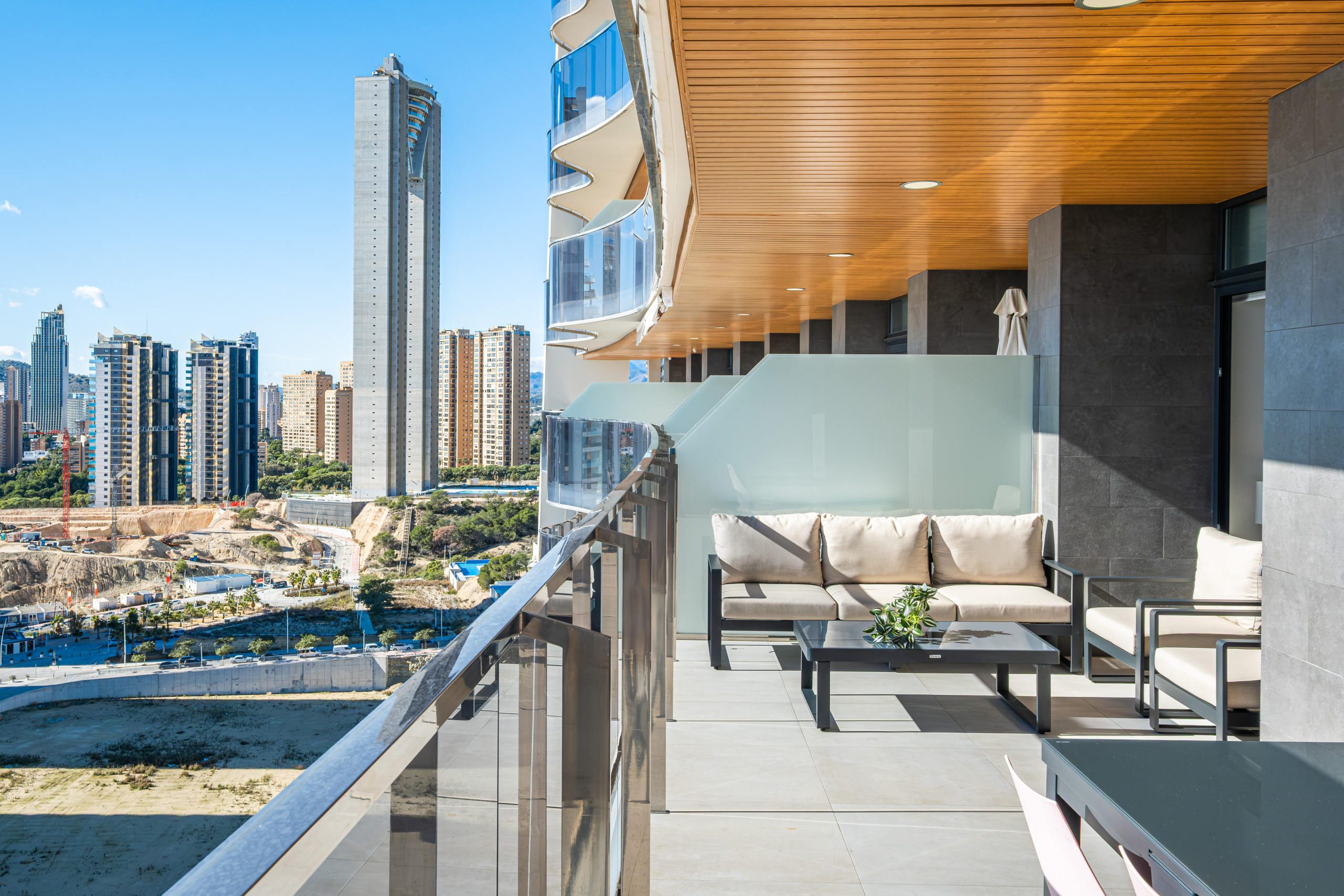 Posee una gran terraza de 25 m2 que rodea toda la vivienda, con impresionantes vistas panorámicas al mar, la playa, la bahía y la ciudad.